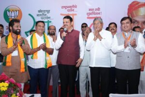 आज संध्याकाळी ७.३५ वाजता कोल्हापूर दौऱ्यावर असताना त्यांनी भारतीय जनता पक्षाच्या स्थानिक कार्यालयास भेट दिली. या वेळी त्यांचे जल्लोषात स्वागत करण्यात आले. त्यांच्या आगमनानंतर भाजपा महिला कार्यकर्त्यांनी औक्षण करून सन्मान केला. तसेच स्थानिक कार्यकर्त्यांनी त्यांना महाराष्ट्राच्या परंपरेचे प्रतीक असलेले वाघनखे, कट्यार आणि छत्रपती शिवाजी महाराज यांच्या राजमुद्रेची प्रतिकृती भेट म्हणून दिली.