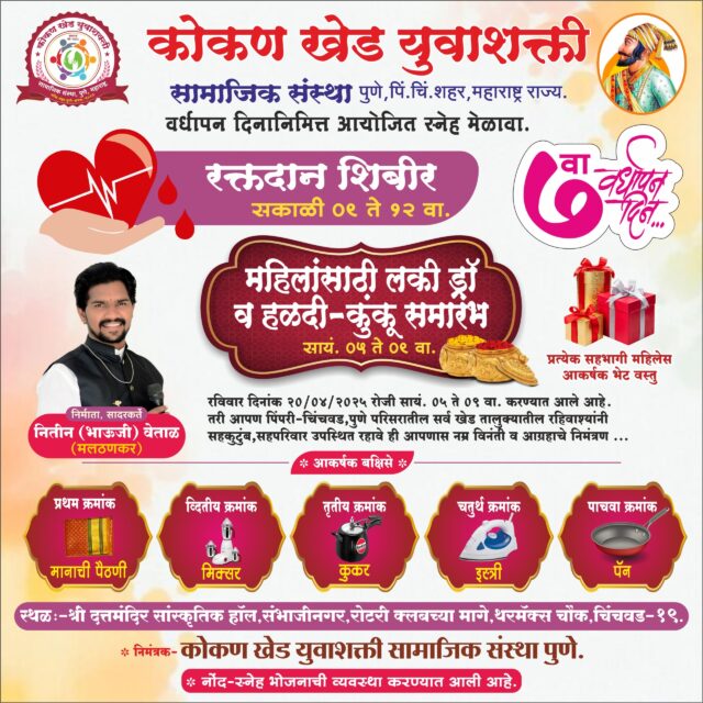 पिंपरी – सामाजिक बांधिलकीचा आदर्श निर्माण करणारी कोकण खेड युवाशक्ती सामाजिक संस्था आपल्या सातव्या वर्धापन दिनानिमित्त एक प्रेरणादायी उपक्रम घेऊन येत आहे. रविवार, दिनांक 20 एप्रिल 2025 रोजी संस्था एक भव्य रक्तदान शिबीर, हळदीकुंकू, लकी ड्रॉ आणि सांस्कृतिक कार्यक्रम यांचे आयोजन करणार असून या कार्यक्रमात हजारो कोकणवासीय सहभागी होणार आहेत.