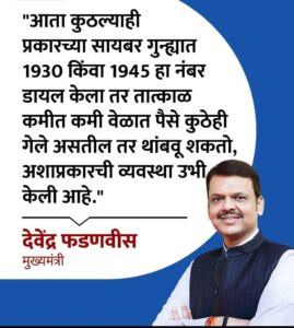 मुख्यमंत्री देवेंद्र फडणवीस यांच्या या पुढाकाराचे सर्वच स्तरातून कौतुक होत आहे. राज्यातील नागरिकांनीही या क्रमांकांची माहिती लक्षात ठेवून सायबर गुन्ह्यांबाबत सजग राहावे, असे आवाहन करण्यात आले आहे.