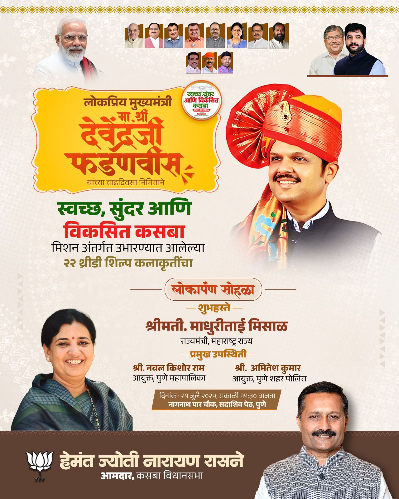 (दि. २१ जुलै २०२५) – ऐतिहासिक आणि सांस्कृतिक परंपरा लाभलेल्या कसबा मतदारसंघाच्या सौंदर्यीकरणाला आता नवीन उंची मिळत आहे. आमदार हेमंत रासने यांच्या पुढाकाराने आणि लोकप्रिय मुख्यमंत्री देवेंद्र फडणवीस यांच्या वाढदिवसाचे औचित्य साधून, “स्वच्छ, सुंदर आणि विकसित कसबा” या अभियानाअंतर्गत तयार झालेल्या २२ ठिकाणी उभारलेल्या थ्रीडी शिल्प कलाकृतींचा लोकार्पण सोहळा आयोजित करण्यात आला आहे.