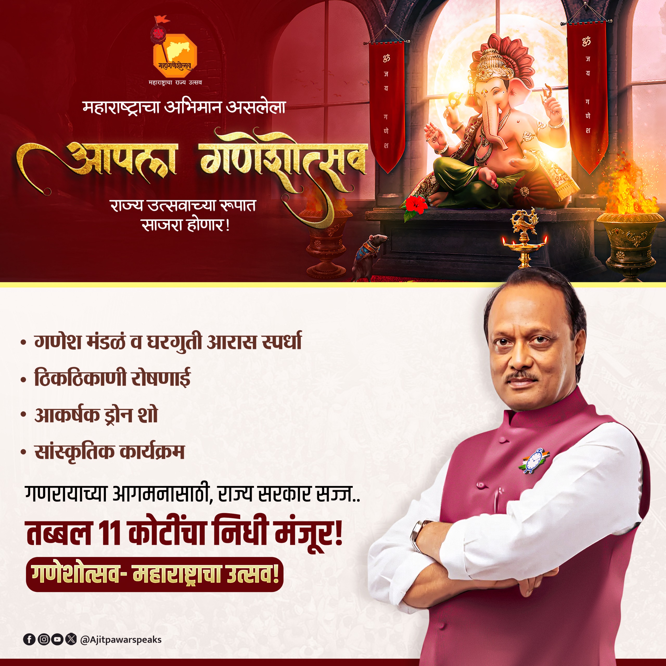 “गणपती बाप्पाच्या आगमनानं सर्वत्र मंगलमय वातावरण निर्माण होवो आणि महाराष्ट्र अधिक प्रगतीच्या मार्गावर वाटचाल करो,” अशी प्रार्थना शासनाने व्यक्त केली.