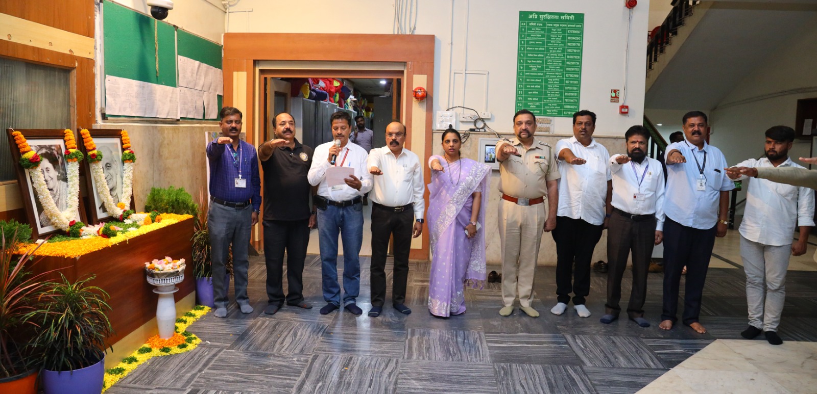 यावेळी उपस्थित अधिकारी व कर्मचाऱ्यांनी “आम्ही अशी शपथ घेतो की, देशाची एकता, अखंडता आणि सुरक्षा अबाधित राखण्यासाठी आम्ही स्वतःला समर्पित करू आणि देशातील बांधवांपर्यंत हा संदेश पोहोचविण्यासाठी आम्ही सदैव प्रयत्नशील राहू,सरदार वल्लभभाई पटेल यांच्या दूरदृष्टीने आणि कार्यामुळे शक्य झालेल्या देशाच्या एकतेच्या भावनेतून आम्ही ही शपथ घेत आहोत तसेच देशाची अंतर्गत सुरक्षा सुनिश्चित करण्यासाठी आपले योगदान देण्याचा आम्ही संकल्प करतो.” अशी राष्ट्रीय एकतेची सामुहिक शपथ घेतली. जनता संपर्क अधिकारी प्रफुल्ल पुराणिक यांनी शपथेचे वाचन केले.