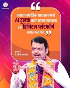 महानगरपालिका निवडणुकीच्या पार्श्वभूमीवर हा निर्णय अत्यंत महत्त्वाचा मानला जात असून, स्मार्ट सिटी संकल्पनेला नवे बळ देणारा ठरणार आहे. राज्यातील सर्व महानगरपालिकांमध्ये टप्प्याटप्प्याने हा AI आधारित डिजिटल प्लॅटफॉर्म राबवण्याचा सरकारचा मानस असल्याचेही मुख्यमंत्री फडणवीस यांनी स्पष्ट केले. या निर्णयामुळे महाराष्ट्र डिजिटल गव्हर्नन्समध्ये देशात आघाडीवर राहील, असा विश्वास व्यक्त करत मुख्यमंत्री म्हणाले की, तंत्रज्ञानाच्या माध्यमातून जनतेला थेट, पारदर्शक आणि गुणवत्तापूर्ण सेवा देणे हेच सरकारचे उद्दिष्ट आहे.