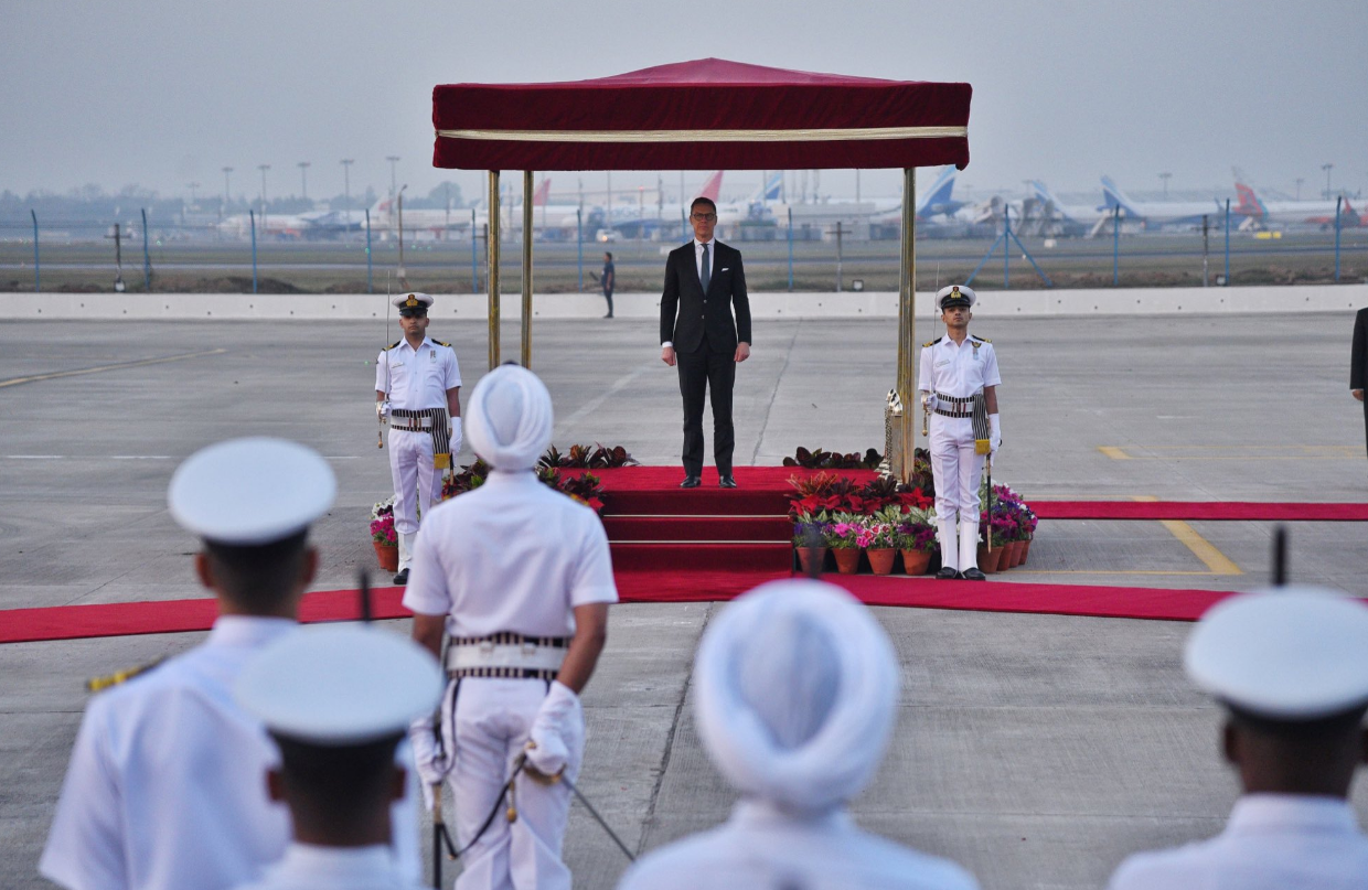 राष्ट्राध्यक्ष स्टुब यांना आगमनावेळी पारंपरिक पद्धतीने गार्ड ऑफ ऑनर देण्यात आला. केंद्रीय परराष्ट्र राज्यमंत्री Kirti Vardhan Singh यांनी त्यांचे स्वागत केले. या स्वागत समारंभात भारतीय परराष्ट्र मंत्रालयाचे वरिष्ठ अधिकारी तसेच फिनलंडच्या प्रतिनिधीमंडळातील सदस्य उपस्थित होते.