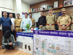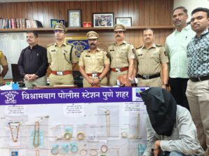 पुणे : Pune शहरात घडलेल्या घरफोडीच्या मालिकेचा मोठा पर्दाफाश करत Maharashtra Police दलातील Vishrambag Police Station तपास पथकाने धडाकेबाज कारवाई करत उत्तर प्रदेशातील कुख्यात गँगस्टरला अटक केली आहे. या कारवाईदरम्यान सुमारे ६२ लाख रुपयांचे सोने-चांदीचे दागिने आणि इतर मुद्देमाल जप्त करण्यात आला आहे.