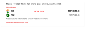 न्यूयॉर्कमधील नासाऊ काउंटी इंटरनॅशनल क्रिकेट स्टेडियमवर खेळल्या गेलेल्या सामन्यात पाकिस्तानला 120 धावांचे लक्ष देण्यात आले होते. पाकिस्तानची स्थिती 12.1 षटकांत 73 धावांवर 3 विकेट अशी चांगली होती, त्यांना रन-ए-बॉल 47 धावा हव्या होत्या, पण बुमराह यांनी आपल्या अप्रतिम गोलंदाजीने सामन्याचा कायापालट केला.