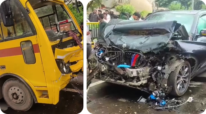 पिंपरी पोलिसांच्या माहितीनुसार, शाळेची बस बीआरटी लेनमध्ये प्रवास करत असताना BMW कार विरुद्ध दिशेने येऊन बसला धडकली. या घटनेत दोन विद्यार्थी किरकोळ जखमी झाले असून त्यांना जवळच्या खाजगी रुग्णालयात दाखल करण्यात आले आहे. अपघाताच्या वेळी बसमध्ये १५ विद्यार्थी होते.