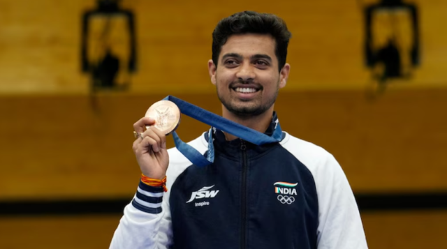 पॅरिस 2024 ऑलिम्पिक्समध्ये नेमबाज स्वप्निल कुसाळेने इतिहास रचला, 50 मीटर रायफल 3P इव्हेंटमध्ये पदक जिंकणारा पहिला भारतीय नेमबाज ठरला. कुसाळेने 451.4 गुणांची कमाई करून चीनच्या युकुन लियू (सुवर्ण) आणि युक्रेनच्या सेरही कुलिश (रौप्य) यांच्या मागे तिसऱ्या क्रमांकावर स्थान मिळवले.