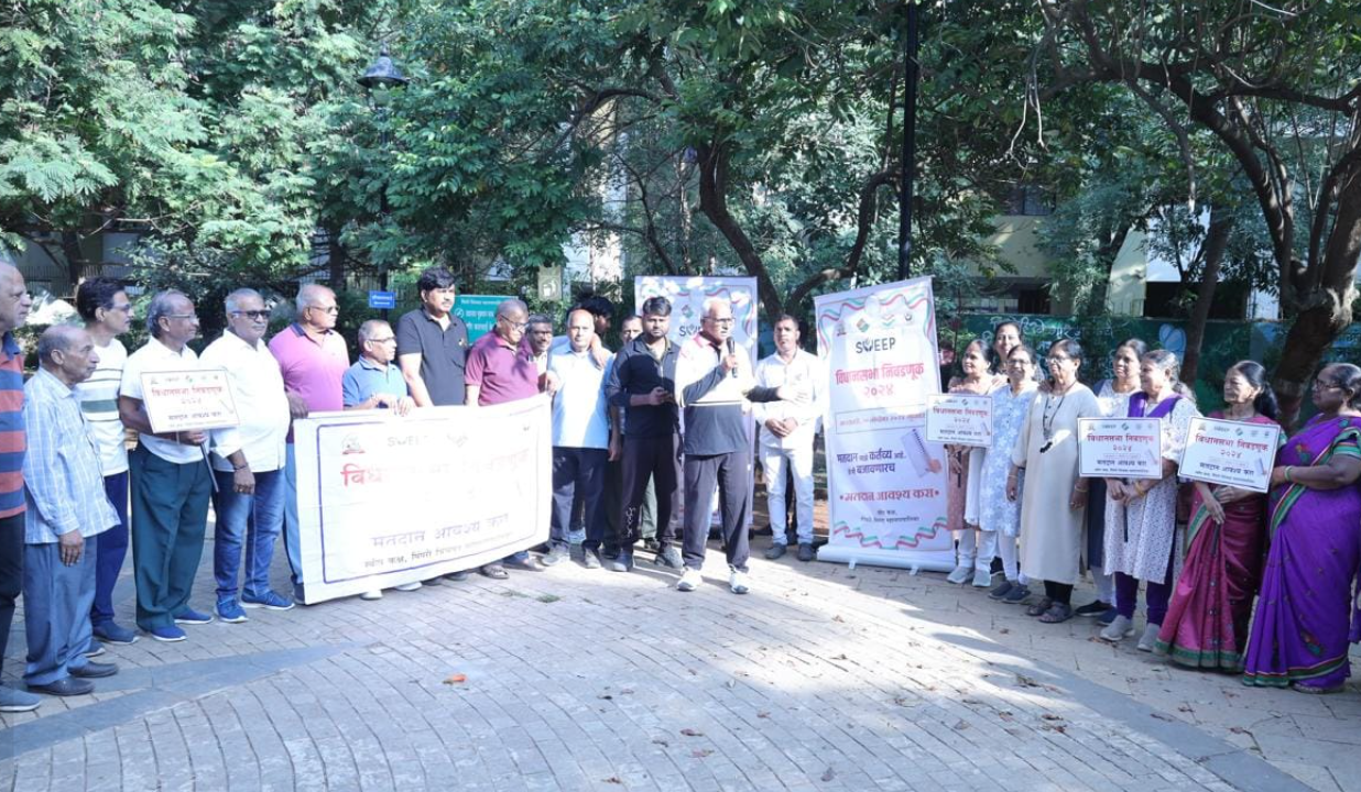 पिंपळे सौदागर येथे स्थित लिनियर गार्डनमध्ये आयोजित चैतन्य हास्य क्लब व ज्येष्ठ नागरिक संघाच्या दैनंदिन कार्यशाळेत एक महत्वपूर्ण उपक्रम पार पडला. सार्वत्रिक विधानसभा निवडणूक २०२४ मध्ये प्रत्येक नागरिकाने मतदानाचा हक्क बजावावा, या उद्देशाने ज्येष्ठ नागरिकांनी मतदान करण्याचा ठाम निर्धार केला. या प्रसंगी पिंपरी चिंचवड महानगरपालिकेच्या मतदान जनजागृती मोहिमेला मोठा प्रतिसाद मिळाला, आणि सर्व ज्येष्ठ नागरिकांनी एकमुखाने मतदानाची शपथ घेतली.