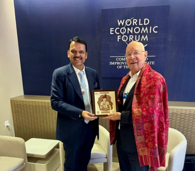 दावोस : महाराष्ट्राचे मुख्यमंत्री देवेंद्र फडणवीस यांनी वर्ल्ड इकॉनॉमिक फोरममध्ये महत्त्वपूर्ण उपस्थिती दर्शवली आहे. यावेळी त्यांनी वर्ल्ड इकॉनॉमिक फोरमचे संस्थापक अध्यक्ष क्लॉस श्वाब यांची भेट घेतली. या भेटीत महाराष्ट्राच्या हरित ऊर्जा, इलेक्ट्रिक वाहनं, व नव्या औद्योगिक संधींवर सखोल चर्चा झाली. महाराष्ट्राच्या विकासाचे उन्नत दिशेने पाऊल टाकणाऱ्या या चर्चेमुळे दावोसमधील महाराष्ट्र पॅव्हेलियन अधिक चर्चेत आले आहे.